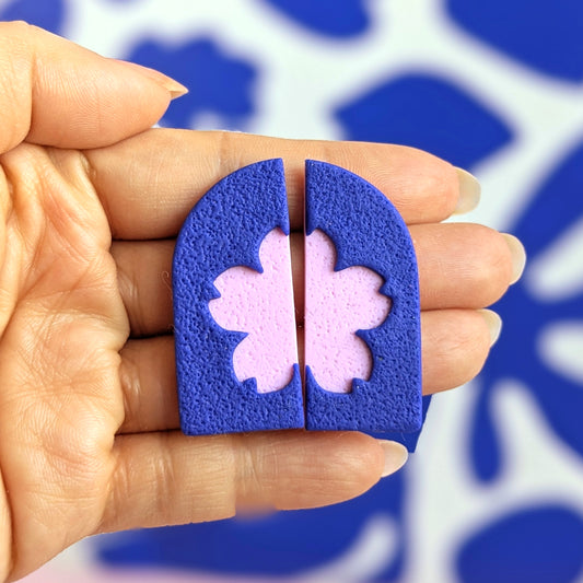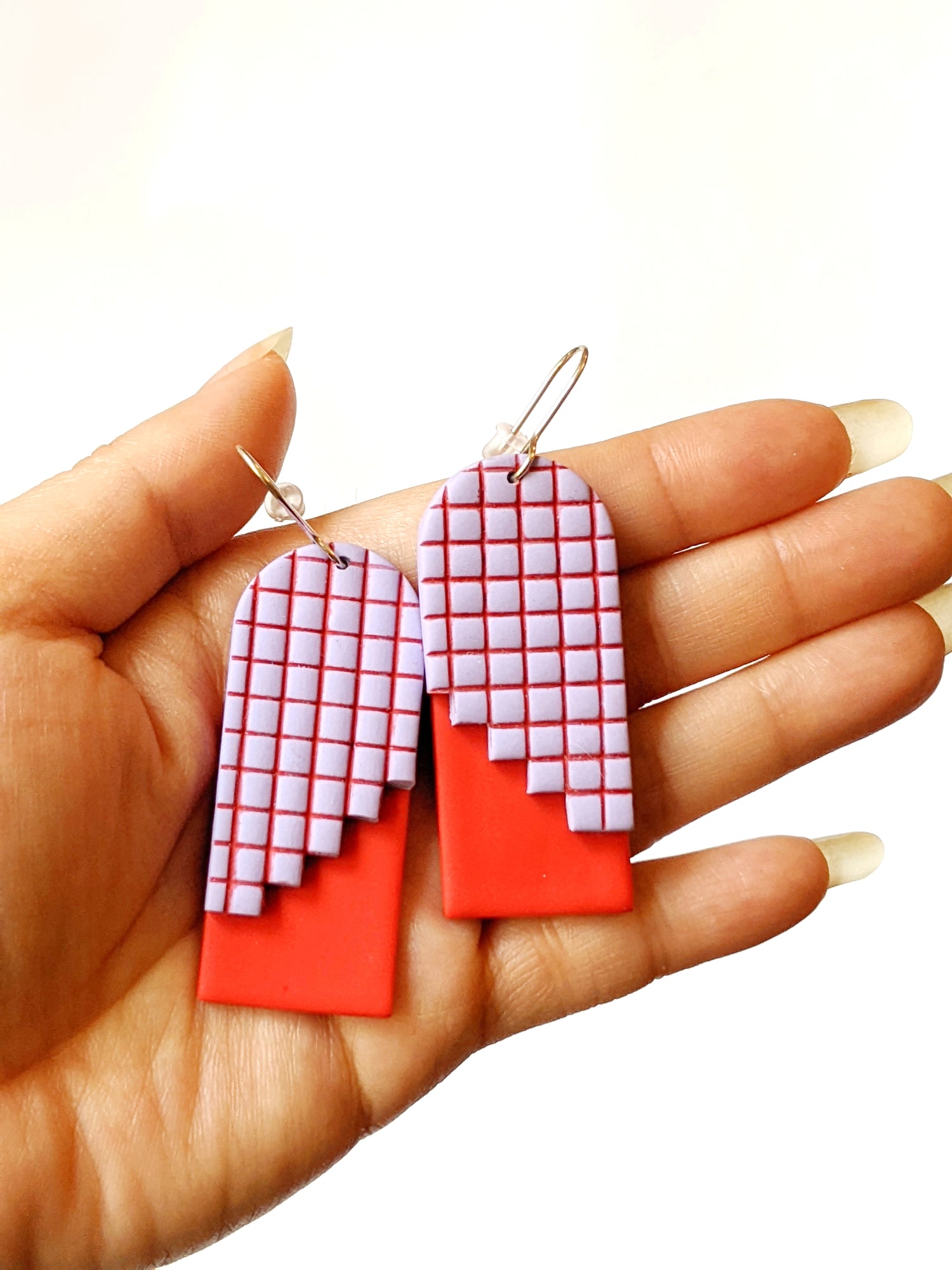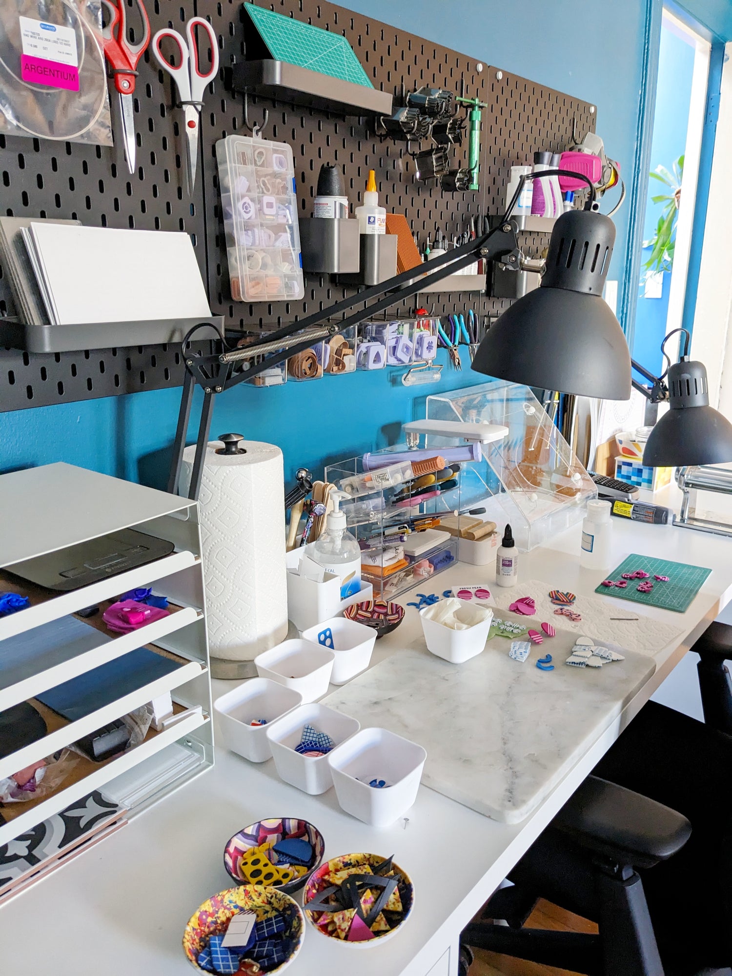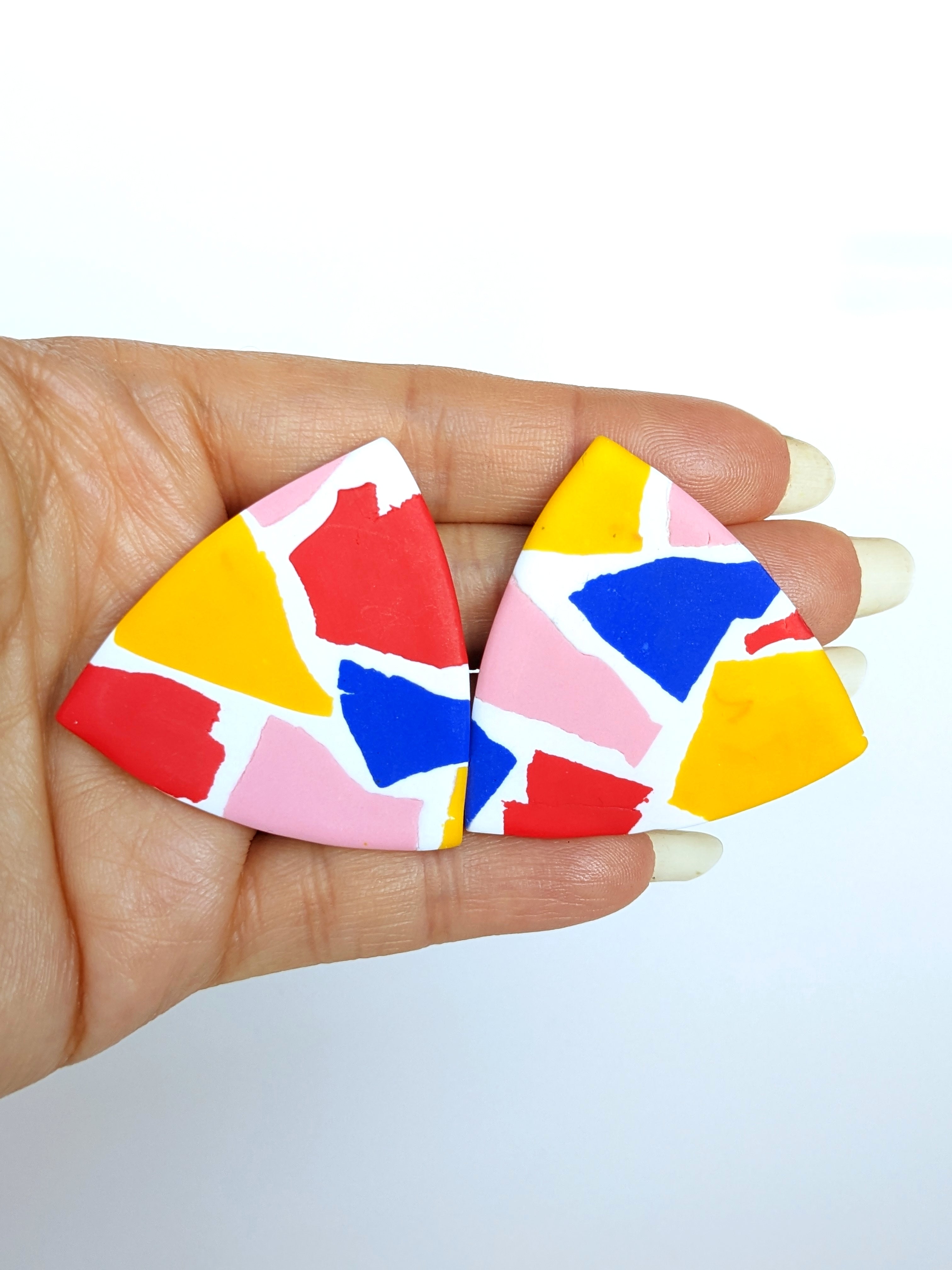 The patterns on my earrings are created by hand: I mix, cut, tear, and place each color onto the surface of the clay before cutting it into earring components. This makes each pair unique and a serious labor of love.