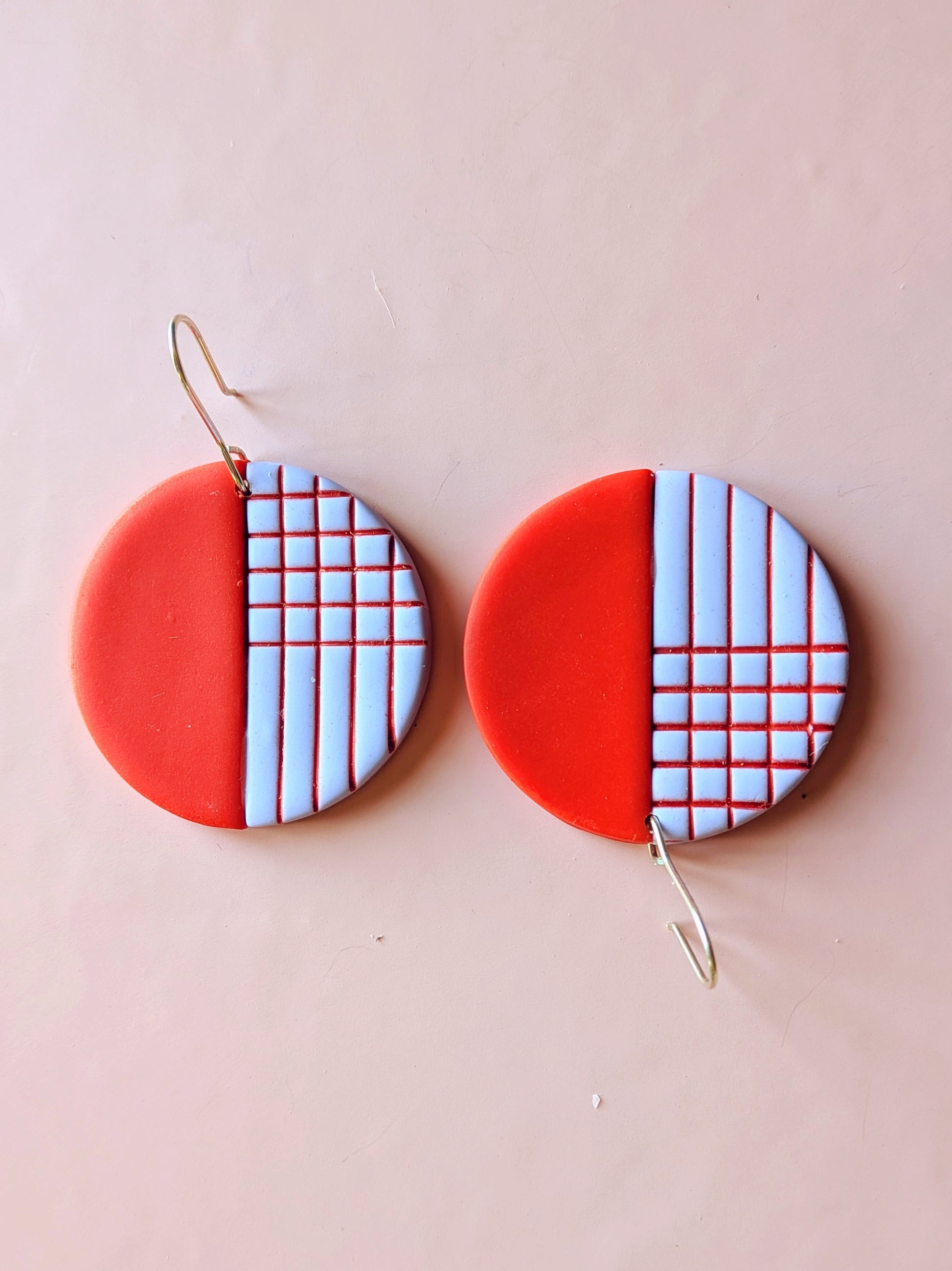 A little art deco, a little vaporwave, a lot of fun. These earrings are made by pressing a grid pattern into the surface and filling in with liquid clay.
